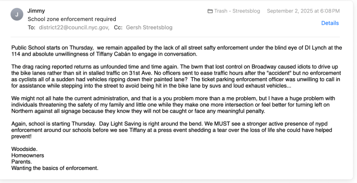 The public is noticing. Out of the blue earlier this week, I got an email from a guy identifying himself as Jimmy from Woodside: “We remain appalled by the lack of all street safety enforcement under … at the 114[th Precinct]. …. I have a huge problem with individuals threatening the safety of my family and little one while they [run a light to] make one more intersection or feel better for turning left on Northern Boulevard against all signage because they know they will not be caught or face any meaningful penalty. School is starting Thursday. … We MUST see a stronger active presence of NYPD enforcement around our schools.”