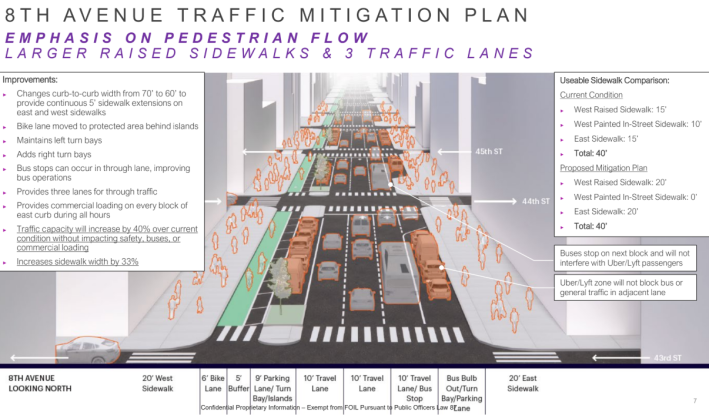 “Our plan is a extremely pedestrian forward plan that mitigates as much vehicular traffic increase in favor of pedestrianization as is possible,” SL Green official Robert Schiffer told Streetsblog. “We are recommending a complete reimagine of Eighth Avenue.”