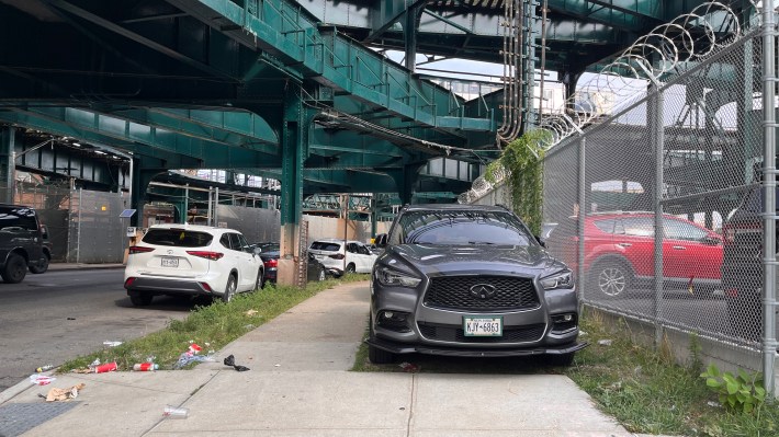 The area between Broadway Junction and Alabama Avenue is filled with parked cars, both legally and illegally, some cars display an NYPD Transit Bureau District 33, the precinct inside Broadway Junction, placard, with varying expiration dates, some have fake-looking "emergency" MTA placards, and most use neon orange MTA "theft vests" to signal they work for the agency.
