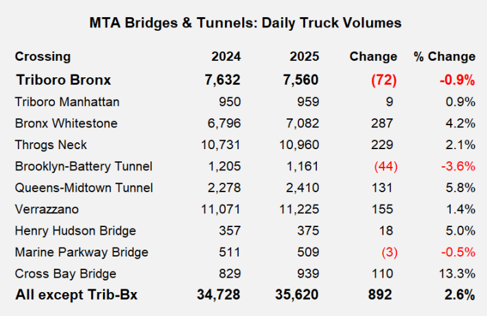 The latest data show that 72 fewer trucks are using the Bronx span of the Triboro Bridge on the average day between Jan. 6, 2025 and Aug. 26, compared to the same period a year ago. That is a slight decrease, but it again dispels some people's prediction that there would be large-scale traffic diversion from Manhattan — and the decrease comes during a period of increased traffic observed on most other MTA tolled crossings: