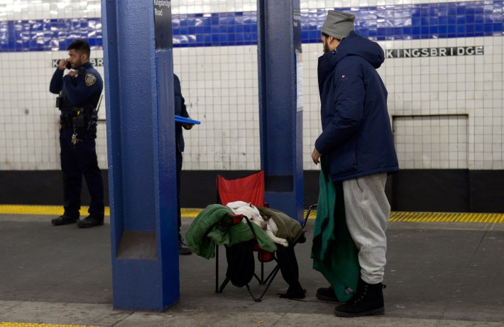 The day’s fifth stop — and the final one Streetsblog observed — is a few stops down the D line at Kingsbridge Road, where Michael and the cops find a scene that's unusual even for New York City: A man is sitting on the platform, next to the sort of fold-out chair you’d find by a campfire; and in the chair, buried beneath sweaters, is a dog. He banters with the cops about dogs, his is a bull terrier, he says; the officer says he has a shepherd. Michael crosses the platform to check the man out. The homeless man tells Michael that he’s waiting on a downtown train to take him to a program in Midtown. The train rolls in, he grabs his things and the dog and gets aboard.