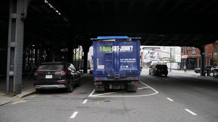 On Tuesday, Streetsblog observed a couple of placard-bearing vehicles and one 1-800-GOT-JUNK truck parked in the blocked-off area. Same as it always is.