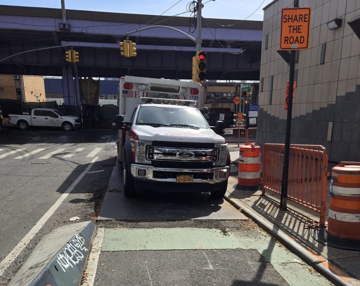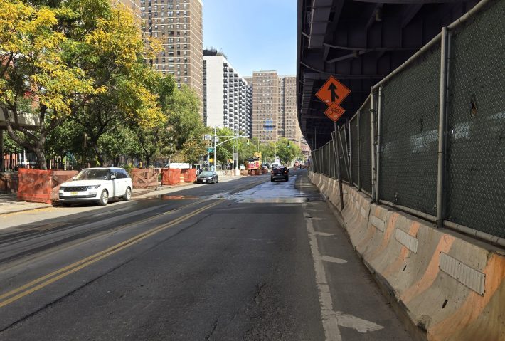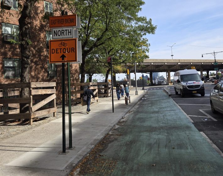 Maddeningly, one doesn’t have to go far to see what DOT could have done to create a safe detour. On the other side of the East River, heavy construction is underway on the Williamsburg waterfront. But in Williamsburg, cyclists aren’t asked to detour into heavy traffic. Instead, the temporary Kent Avenue bikeway is separated from car traffic by concrete barriers, temporarily replacing on-street parking. This type of cheap, quick fix is something DOT could and should do for the East River Greenway during construction.