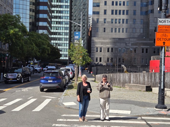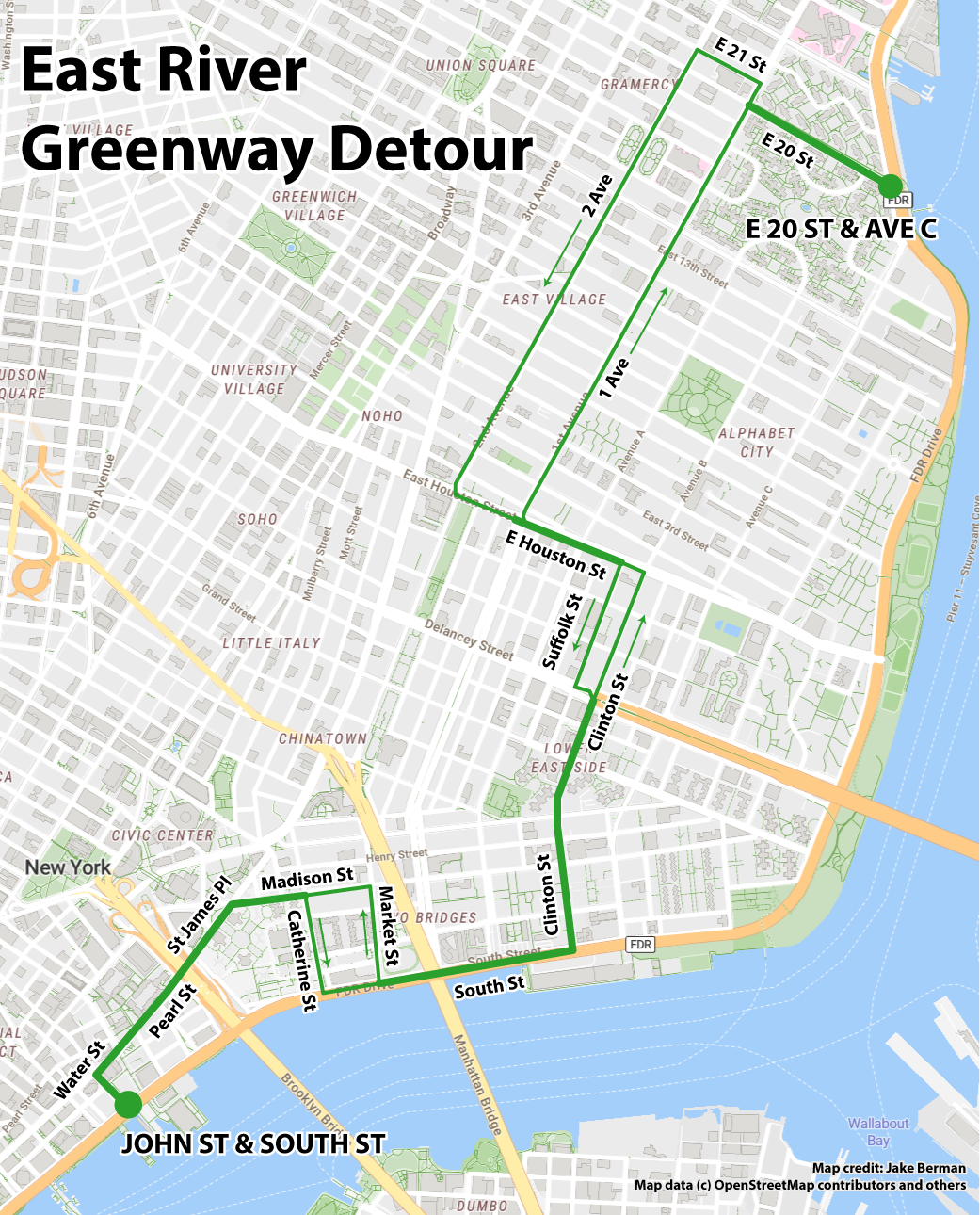 The Greenway detour starts at John Street and South Street in the Financial District. The route through the Financial District and Civic Center has heavy car and truck traffic, and none of this is a proper replacement for the East River Greenway’s protected bike path.