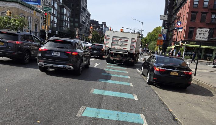 North of South Street, the situation is little better. Clinton Street below Delancey Street has a protected bike lane, but the lane was blocked by illegally parked city vehicles.