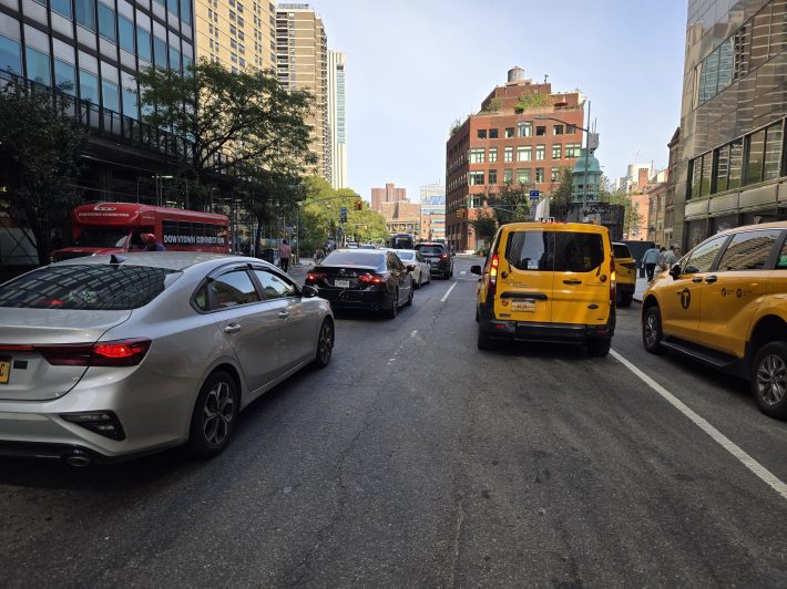 Continuing above Delancey Street on Clinton Street, I was forced into the car lanes by ambulettes, moving vans and Ubers blocking the bike lanes. After that, on Houston Street, the bike lane is squeezed between car lanes, and merging car traffic comes from both sides.