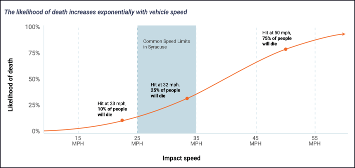 Syracuse has long had a road violence problem. According to federal stats covering 2019 through 2023, there were 567 car crashes in the city, causing 42 deaths and 608 serious injuries. Nearly half of the fatal crashes involved a pedestrian or bicyclist. Syracuse’s fatality rate (deaths per year per 100,000 residents) is 7.27, which is 40 percent higher than the state’s rate and 150 percent higher than New York City’s below-3.0 rate.