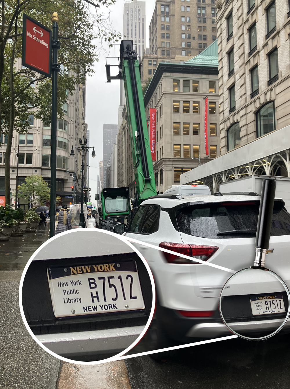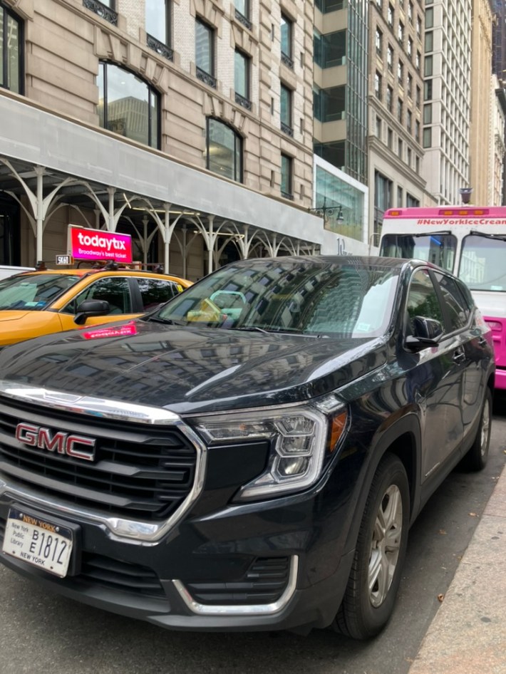 Just behind the intersection is a no-standing zone, marked with a big red sign. But it was clogged with vehicles, as it always is. The most egregious offender, parked just short of the crosswalk and thus blocking driver visibility from behind, was a massive GMC SUV with a New York Public Library plate (right).