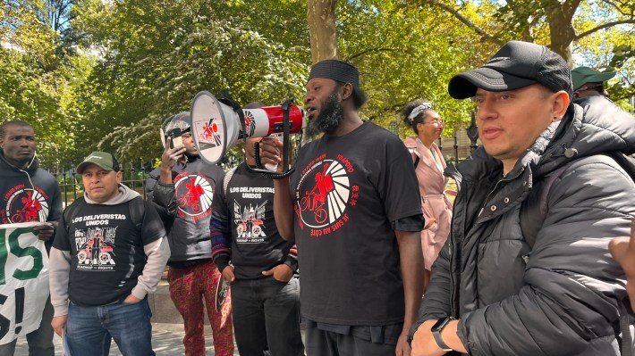 “The companies think the deliverista is a machine that has to ride through the city without regard for their safety,” Guallpa said at the rally. “[The app companies] are accusing the deliveristas of taking too long to make a delivery.”