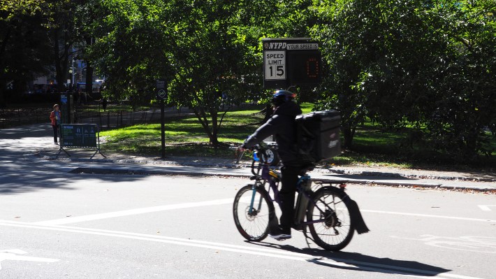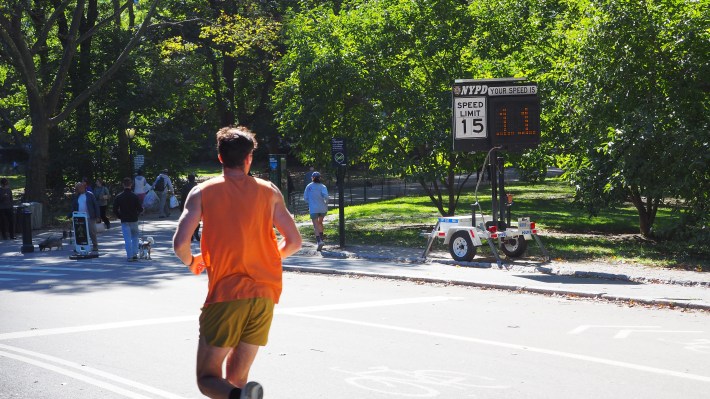 A mobile speed sign installed by NYPD in Central Park in hopes of educating cyclists if they are exceeding a 15-mile-per-hour speed limit that goes into effect next week is delivering readings that are as accurate as a rectal thermometer in a penguin.