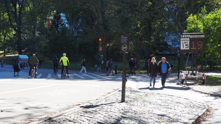 A second intersection inspected by Streetsblog on Thursday — near the Wollman Rink — had the new flashing-yellow treatment and a working speed billboard. And the combination did seem to have traffic flowing more orderly and more slowly through it.