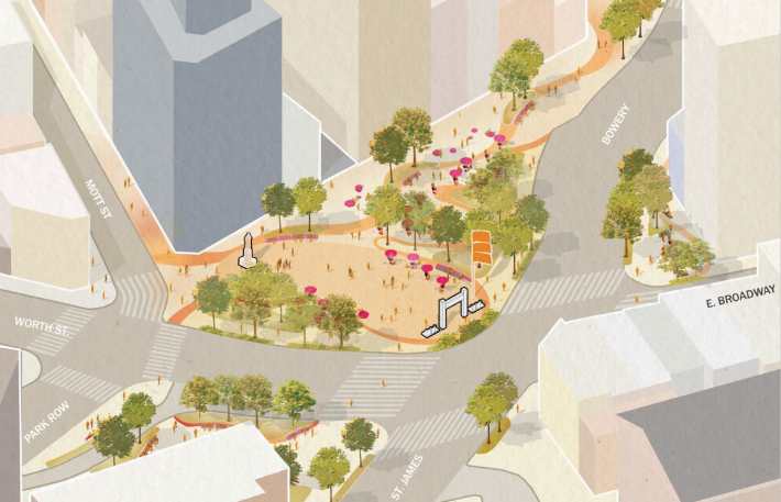 The redesign unveiled on Tuesday would flip the plaza from the east to the west side of the Bowery, near Worth Street, and straighten out the seven-way intersection around it.