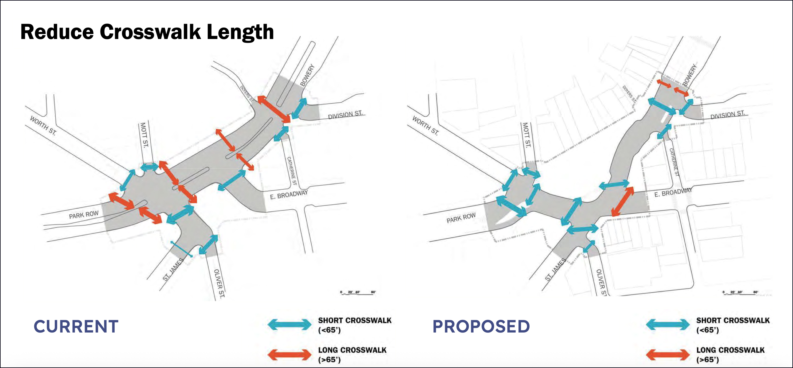 Pedestrians have to cross wide roads feeding car traffic around Lower Manhattan, which is especially challenging for the neighborhood’s disproportionately elderly population.