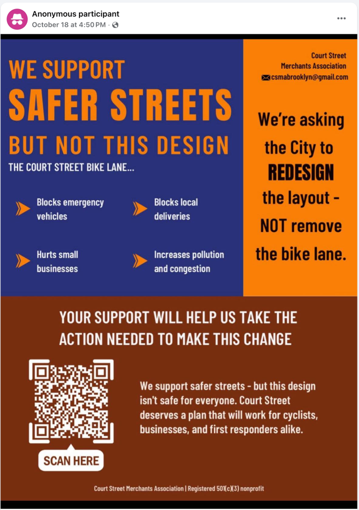 The organization claimed on Facebook that its members “support safer streets, but not this design,” a common refrain from opponents of street safety projects that are intended for “their” streets.