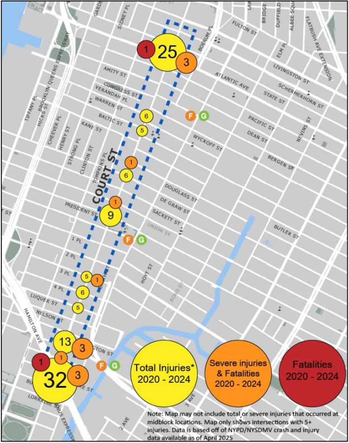 The corridor was among the most dangerous roads in Brooklyn, with 155 people injured in five years through 2024, including two fatalities, clustering around dangerous intersections like Hamilton Avenue and at Atlantic Avenue, according to Department of Transportation data.