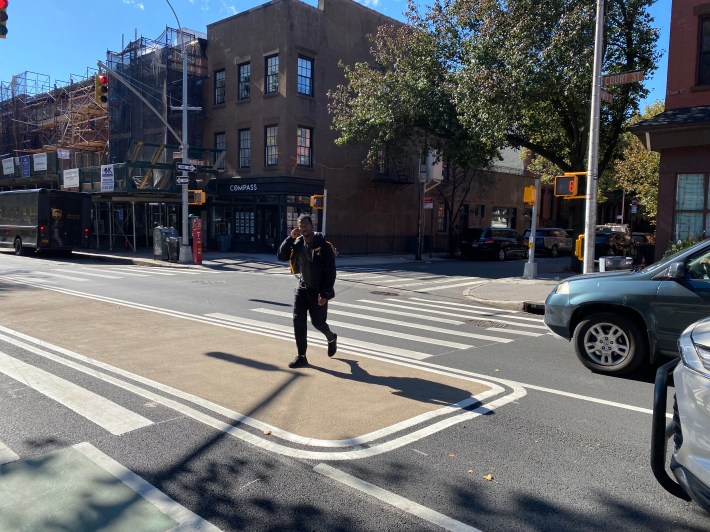 At other locations, painted pedestrian islands were working as intended, giving walkers a much shorter crossing distance, like at this T-intersection at Warren Street.