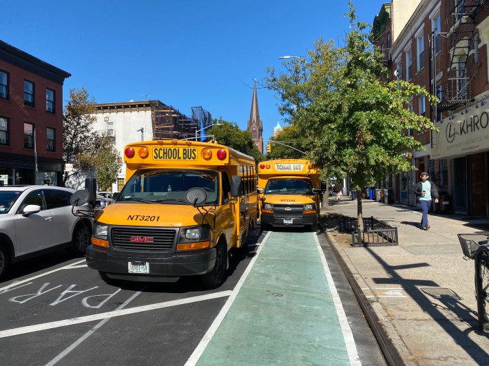 Meanwhile at Baltic Street, several school buses were parked in the bike lane and the daylighting spot at the corner, endangering cyclists and pedestrians at the corner right across the street from a school. Not a great look from professional drivers tasked with safely transporting children.