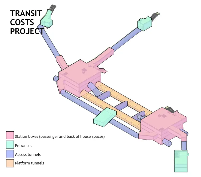 Another area where Istanbul has reduced costs through learning and innovation is station design, which is a major driver of rail construction expenses. Underground stations require large-scale excavation, land acquisition, and navigation of complex underground utilities. In early projects like M4, station designs were bespoke, with large mechanical spaces and extensive cut-and-cover construction. Over time, however, stations became more standardized. Starting with M5, key technical components like fan rooms were relocated from large dedicated mechanical spaces to more compact tunnels at the platform level, significantly reducing excavation volumes and cutting construction and land costs by tens of millions of dollars.