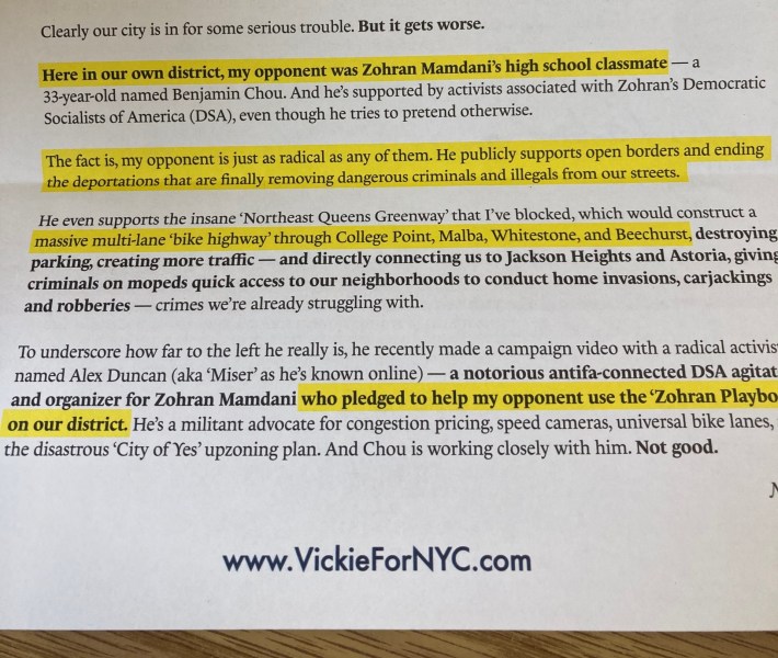 Paladino has made a name for herself as a committed foe of street safety — even though her district led the city in traffic fatalities in 2024. Meanwhile, Chou has welcomed support from pro-cycling advocates and organizations, made overtures to the r/Micromobility sub-reddit and won a StreetsPAC endorsement on the strength of his commitment to daylighting and bringing more protected bike lanes to his district. He also is a strong supporter of the Queens Waterfront Greenway.