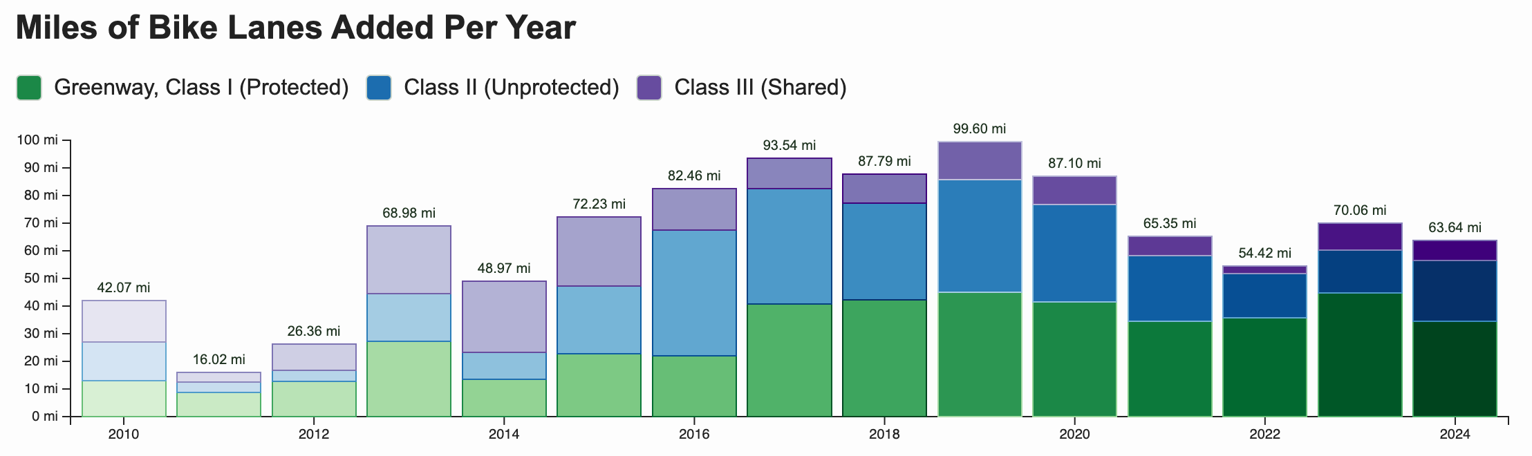 On the plus side, under Mayor Adams, the share of unprotected bike lanes and sharrows as a percentage of the total bike lane mileage has dropped. Mayor Adams also kept pace with his predecessor’s greenway installations in 2022 and 2023 with 19.5 miles and 13.8 miles, though some of those bike lanes aren’t on the actual street grid and that number fell to 8.1 miles last year.
