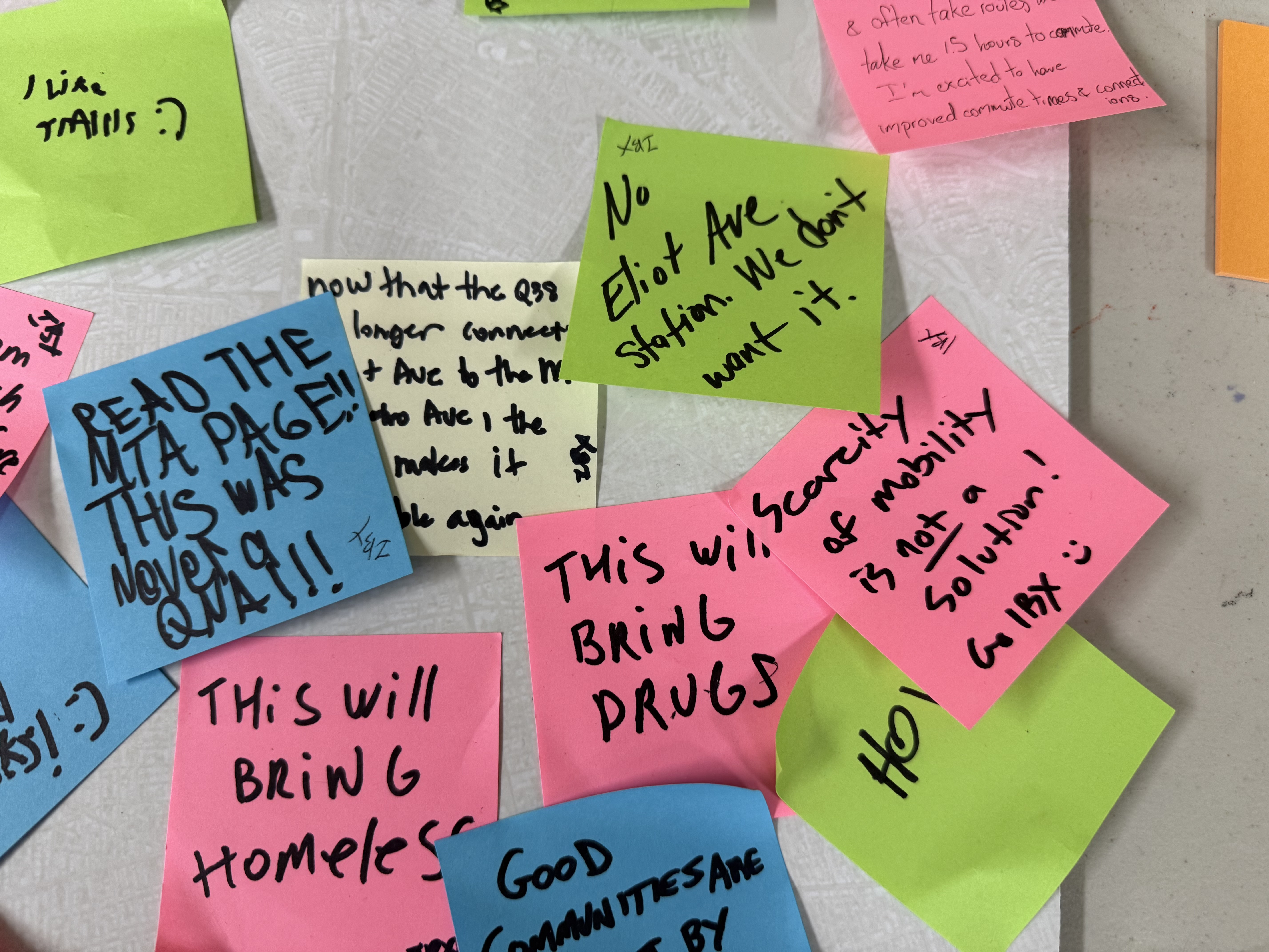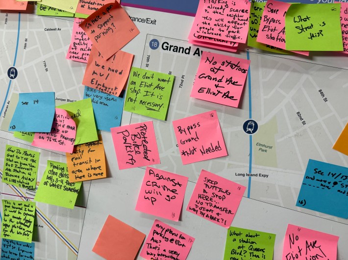 The MTA scheduled Wednesday night’s meeting to gather feedback on certain aspects of the IBX — not about whether the project should happen at all. Still, a number of attendees decorated a detailed site map with hand-written notes demanding that the stations simply not be built at all.