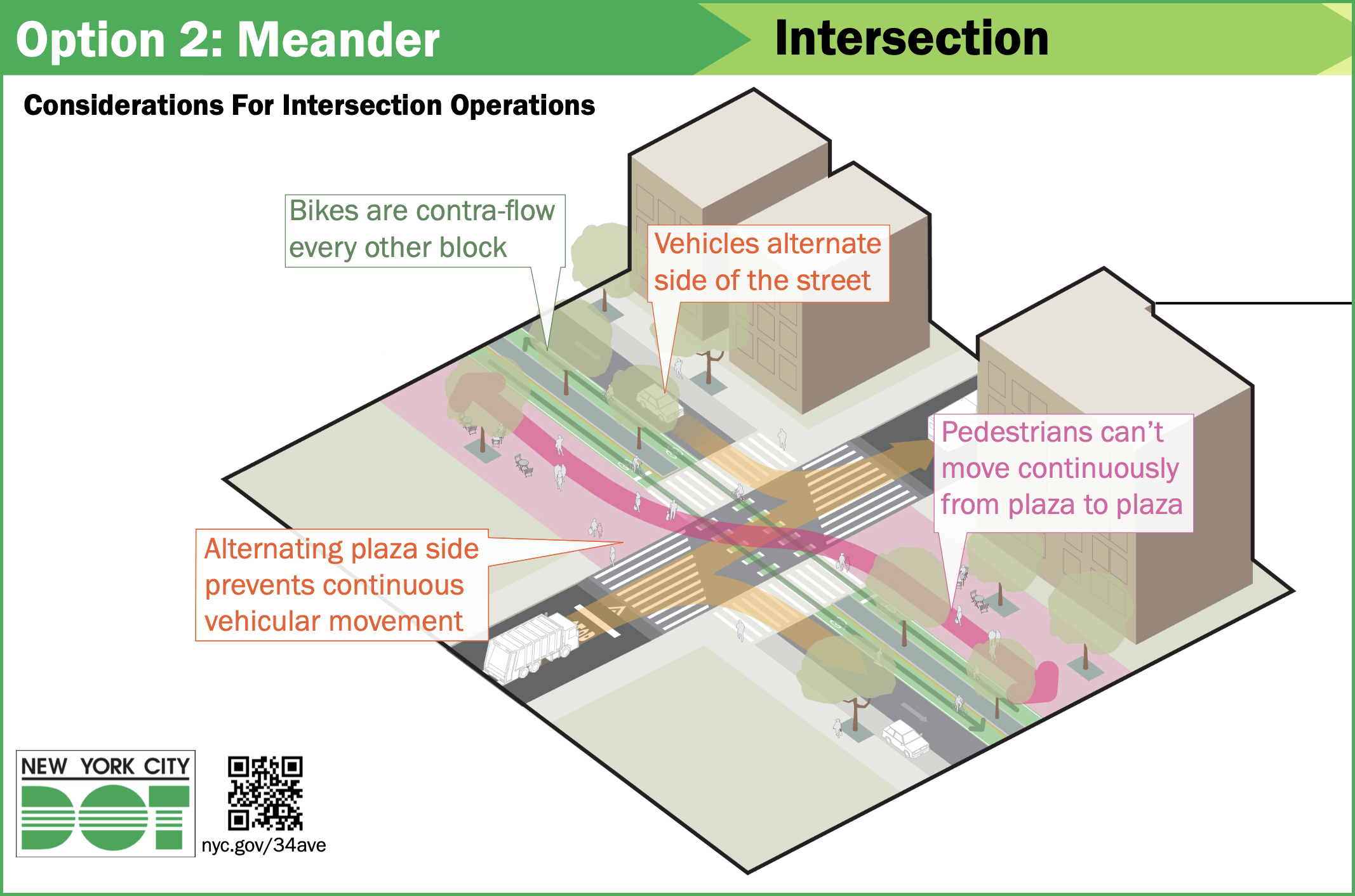 After months of gathering local feedback, the DOT narrowed its redesign plans into two options [PDF]: Option 1 offers a straight “promenade” design that divides pedestrian plazas and “shared traffic” lanes into parallel corridors, whereas Option 2 offers a zig-zagging “meander” design that switches the pedestrian plazas and the shared traffic lanes at every intersection.