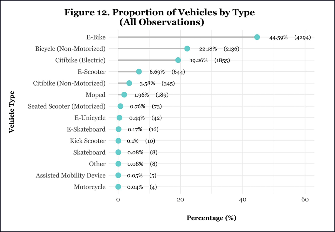 The findings of the study, Understanding Micromobility in New York City, reveal that all “motorized micromobility vehicles” — basically anything with a motor – comprise 74 percent of the vehicles observed in protected bike lanes at five sample locations. And around 64 percent of the vehicles were electric bikes — far and away the largest category of vehicles in the city’s protected lanes.