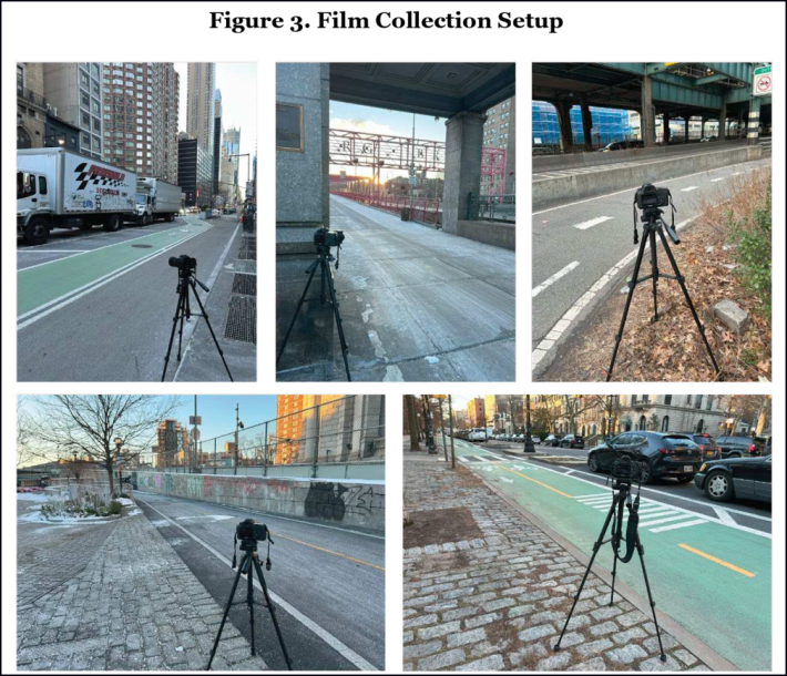 The study looked at five sites where there are already Department of Transportation bike count sensors – 50th Street and Eighth Avenue, Prospect Park West, and the Queensboro, Williamsburg and Manhattan bridges – over the course of a week during 2-3 hour spans sorted into 10-minute chunks in the morning and at mid-day.