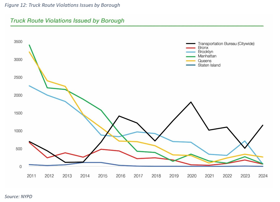 The NYPD contested this analysis, and told Streetsblog that it has not let up on enforcement despite its own published data, but has shifted to a “more targeted, impact-driven” approach “rather than a reduction in overall truck compliance efforts.”