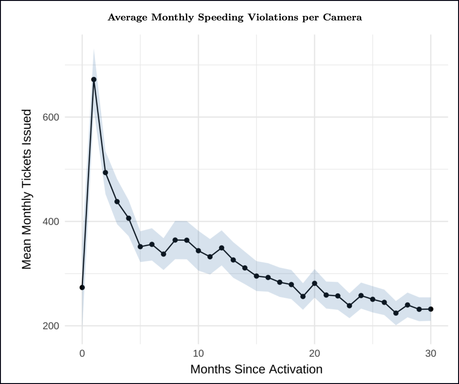 the number of tickets drop dramatically as people start driving more slowly, revealing that “effective deterrence does not require harsh penalties,” the report stated: “Violations spiked immediately following activation, then declined rapidly — a 26.5-percent drop from the first to second month and a 47.7-percent drop from baseline by the fifth month.” As the graphic shows: