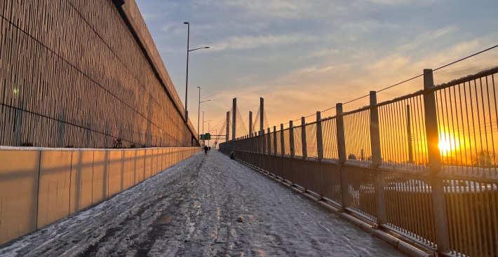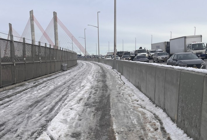 And, finally, when car drivers complain that there are “too many” bike lanes that are never used, we’d like to point out that our transportation needs don’t get served in the same manner as drivers’. Case in point, our own Sophia Lebowitz was biking from Brooklyn to Queens for the 2025 performance of the Car-Free Carolers at around 1 p.m. on Monday — nearly 24 hours after the last flakes fell. Here’s what she discovered on the Kosciuszko Bridge: