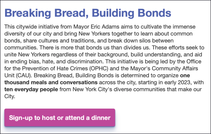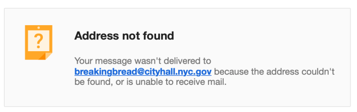 And the “Whatever Happened To…” Award goes to “Breaking Bread, Building Bonds”! Very few of you will remember this — and, indeed, it hasn’t been mentioned in any other outlets’ year-in-review pieces yet, but early in his term, Mayor Adams solicited everyday New Yorkers to sign up to host a meal for eight to 10 fellow residents “to learn about each other, share cultures and traditions, and break down the silos between our communities.” It was a great idea for which the mayor got virtually no credit … so he promptly abandoned it … and also took credit for it last week in an interview with Marcia Kramer, who obviously didn’t know what he was talking about. (I know about this failed program because I signed up in March 2023, underwent a training session, was approved as a host … and never heard a thing after May 2023. I emailed the special host address — breakingbread@cityhall.nyc.gov — for comment last week and didn’t hear back, for reasons you can see below):