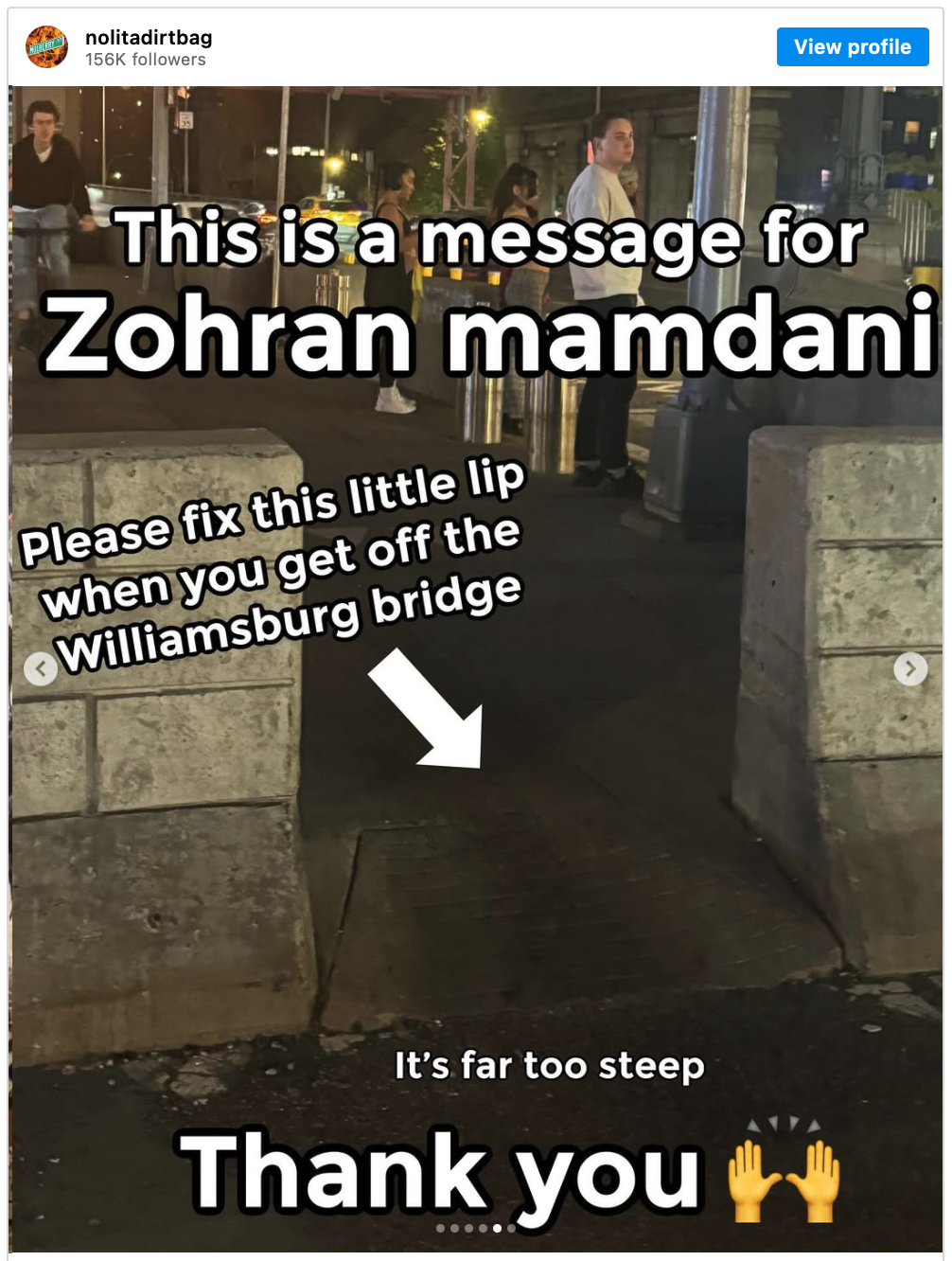 He didn’t know if he’d seen Streetsblog’s seminal video from the summer about the bump, only that he has “seen many, many videos, tweets, and also heard from many New Yorkers as well. I love biking across the city and I also know that we make it more difficult than it has to be,” Mamdani said.