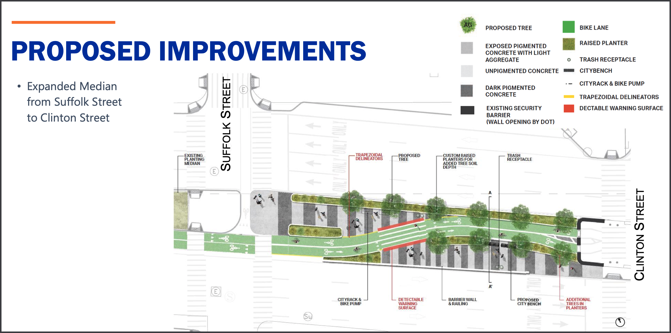 The proposed design presented Community Board 3 in June of 2023 improves the current clusterfuck by adding another cut through the concrete barrier that surrounds the bridge entrance. It would also raise the bike lane and create a raised pedestrian path all the way down Delancey Street to the Bowery, similar to the center-running Allen Street elevated plaza.