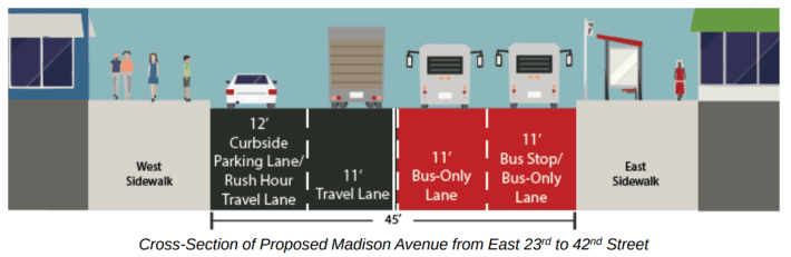 The now-unpaused plan will bring a double bus lane configuration to Madison Avenue between 42nd and 23rd streets. When the bus lanes are painted this year, the street will have two lanes for buses, one general travel lane for private cars and trucks, and a curbside lane that will be a travel lane during rush hour and a parking lane the rest of the time.