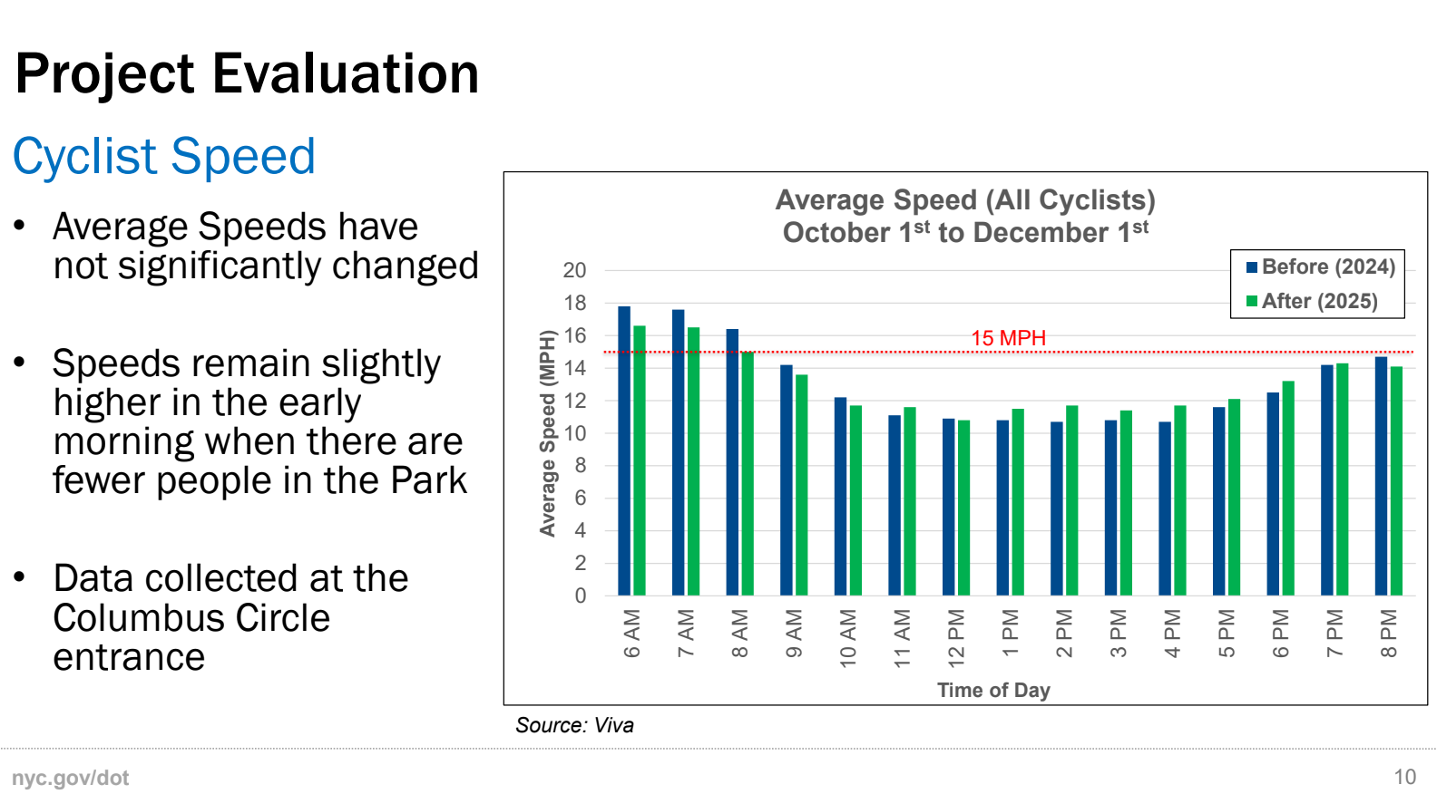 Cyclist speeds remained relatively steady after the redesign was installed, DOT found. Speeds were highest in the early morning, when cyclists typically exercise on faster road bikes. After 8 a.m., when pedestrians make up a larger portion of park-goers, speeds taper off to at or below 15 mph, DOT observed.