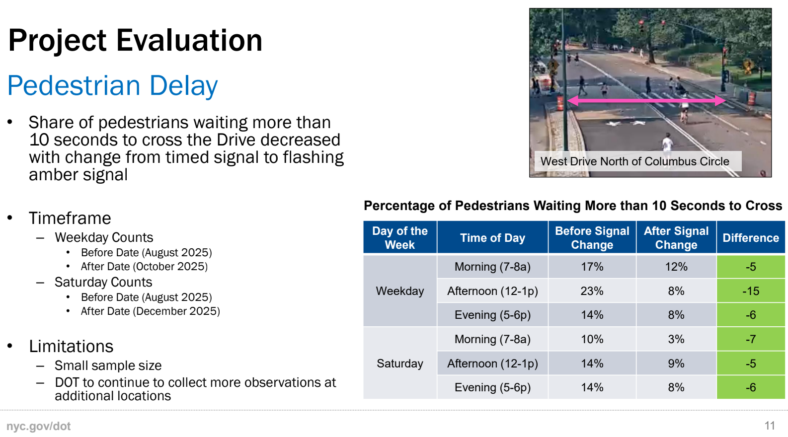 The percentage of pedestrians waiting more than 10 seconds to cross the drive dropped at all times observed by DOT on a weekday and a Saturday after the redesign, officials told the Manhattan Community Board 7 Parks and Transportation committees last Monday.