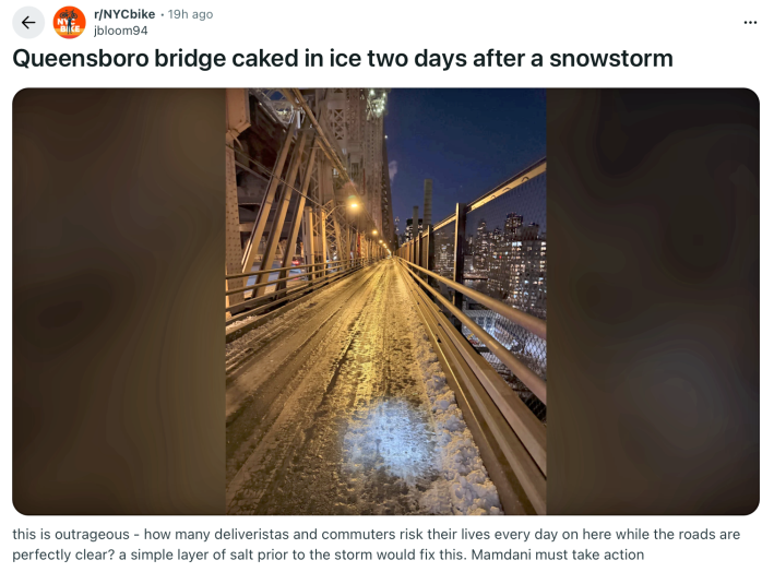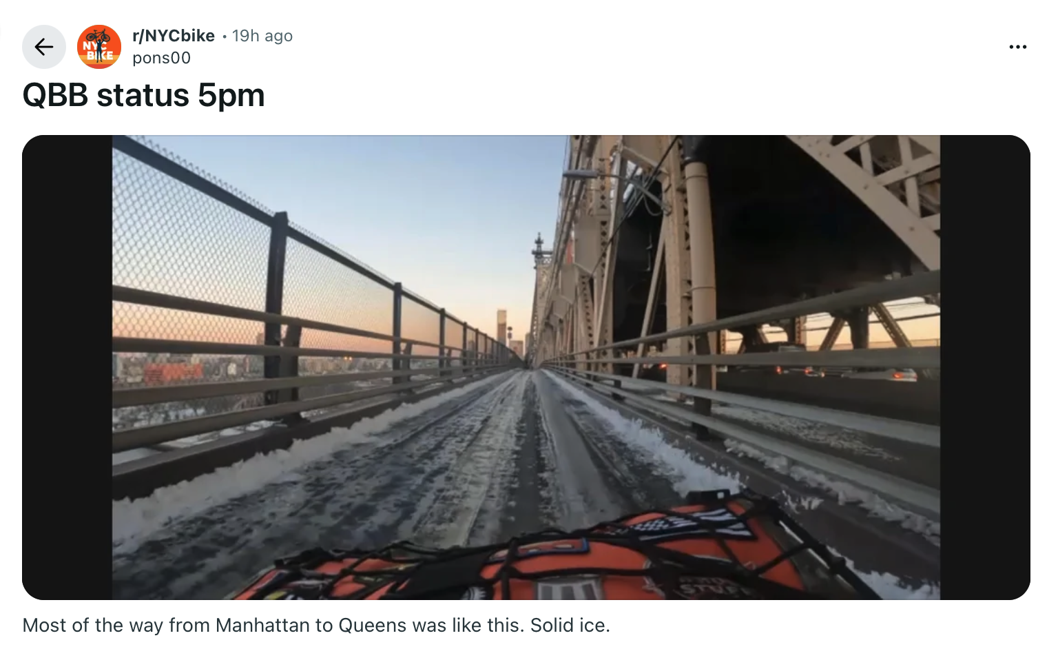 And by Wednesday morning, another commenter reported that the bridge was still icy, though a bit better. One cynic also pointed out, “On Monday afternoon, all the roadways were totally clear, and the bike lanes were icy. But what do I know?”