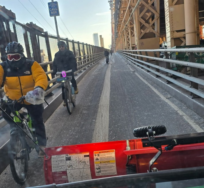 Photographic evidence suggests that the Department of Transportation did not fully clear the way for riders — many of whom are delivery workers — on the second-busiest East River bridge (and the only one to link Queens directly to Manhattan Island).