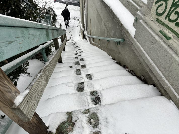 Here’s a set of steps leading from Seeley Street to Prospect Avenue in Brooklyn. Typically, this is shoveled out promptly by the Department of Transportation. But it wasn’t at 9 a.m. on Monday: