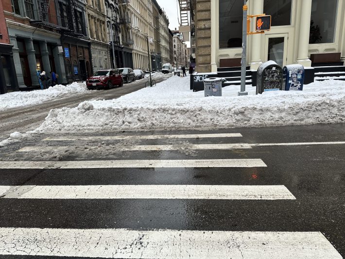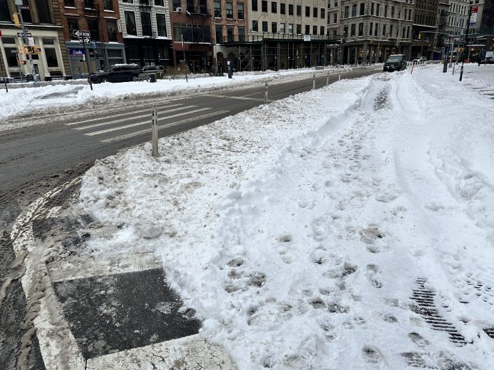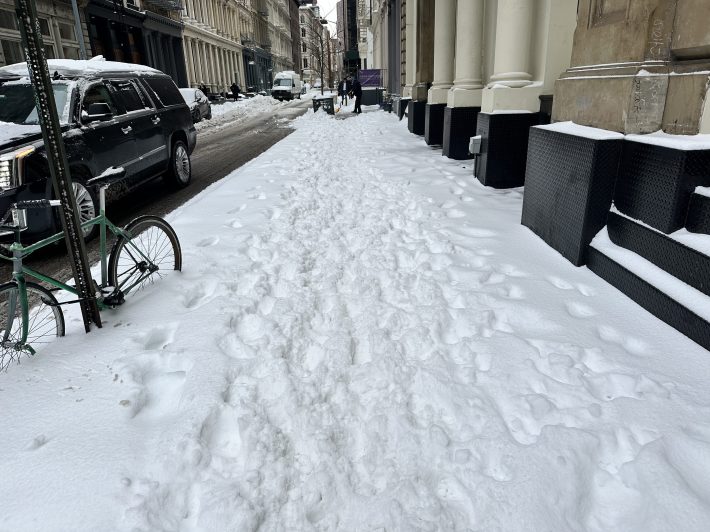 Here’s a sidewalk on White Street in Tribeca that had clearly not seen a shovel since the storm started on Sunday night (no, landowners don’t get a free pass because the storm started on a weekend):