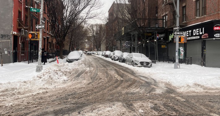 (Update: According to the Department of Sanitation, the storm ended at 8:30 a.m. on Monday, a very generous definition of “ended.” Summonsing for unshoveled sidewalks will begin at 12:30 p.m. today. The agency said it has 551 Emergency Snow Shovelers employed alongside the Sanitation workers to keep working on bus stops bike lanes and corners today.)