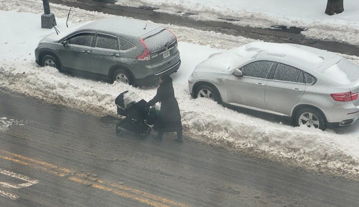 And what about this person pushing a stroller in the middle of the street because the sidewalk (while seemingly all right for a single walker) isn’t cleared enough for families?