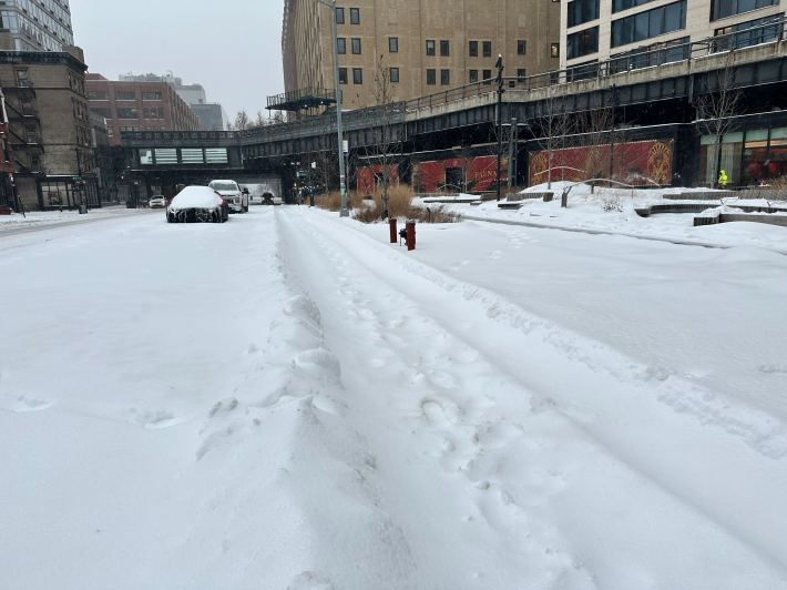 The city’s Plow.nyc streets tracker showed frequent plowing throughout the day in most parts of the city, but plows failed to keep up for much of the day with the fast pace of the snowfall, as Streetsblog Editor-in-Chief Gersh Kuntzman saw on the 10th Avenue bike lane in Manhattan just before 3 p.m.