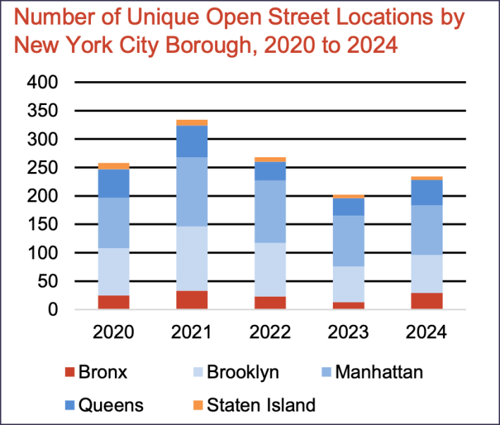 And at those 200 or so locations, more than 67,200 jobs were created — with nearly a majority of those slots (46 percent) created at the 62 locations that had an open street for all five years between 2020 and 2024. Almost 98 percent of those were created in Manhattan and Brooklyn, but that's because those boroughs are more likely to have had open streets from the start of the pandemic through 2024.