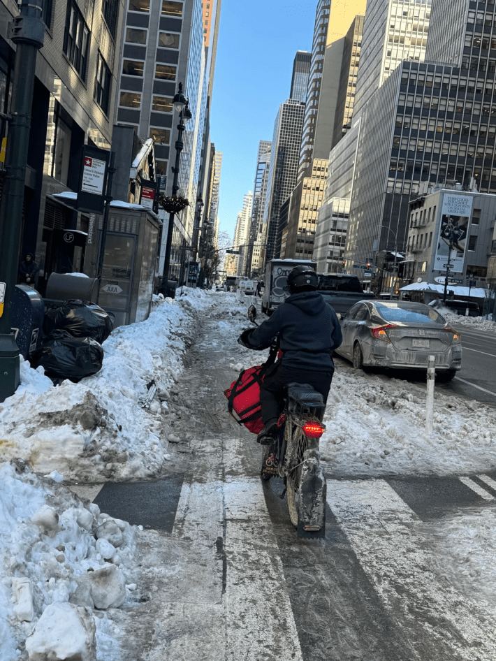 There are also meteorological challenges. When the city clears snow, it pays special attention to car travel lanes while many of the city’s bike lanes – vital infrastructure for delivery workers – remain perilous.