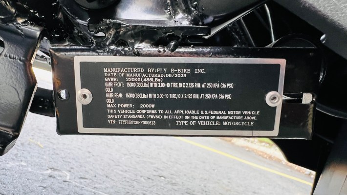 Affixed to the bottom of the moped we tested was a metal plate that read: “This vehicle conforms to all applicable U.S. Federal Motor Vehicle Safety Standards.”