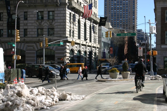 The only current westbound crosstown protected bicycle lanes in the area are on 29th and 13th streets. Union Square Park has a protected bike lane on the north and east sides, but the bike lane stops abruptly at Park Avenue South. This leaves cyclists traveling west along E. 17th Street to the park to ride into a busy four-lane road, swerving through traffic or riding along the pedestrian crosswalk.