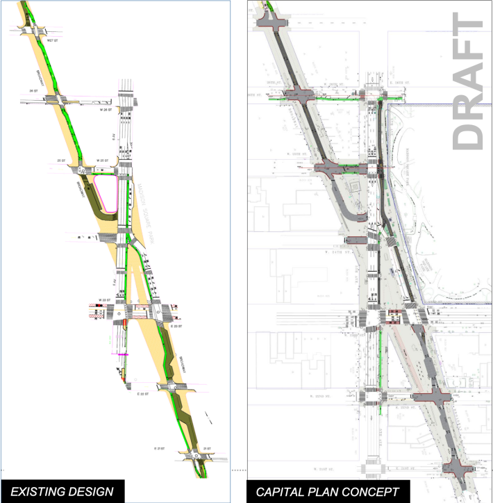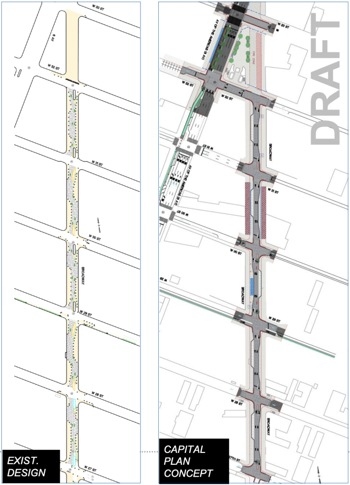 There will be five new raised blocks, pedestrian plazas, protected bike lanes, a new roadway alignment, and security bollards, according to DDC. There will also be curb extensions and raised crosswalks to calm traffic, landscaping, signage, planters, street furniture and concession kiosks.