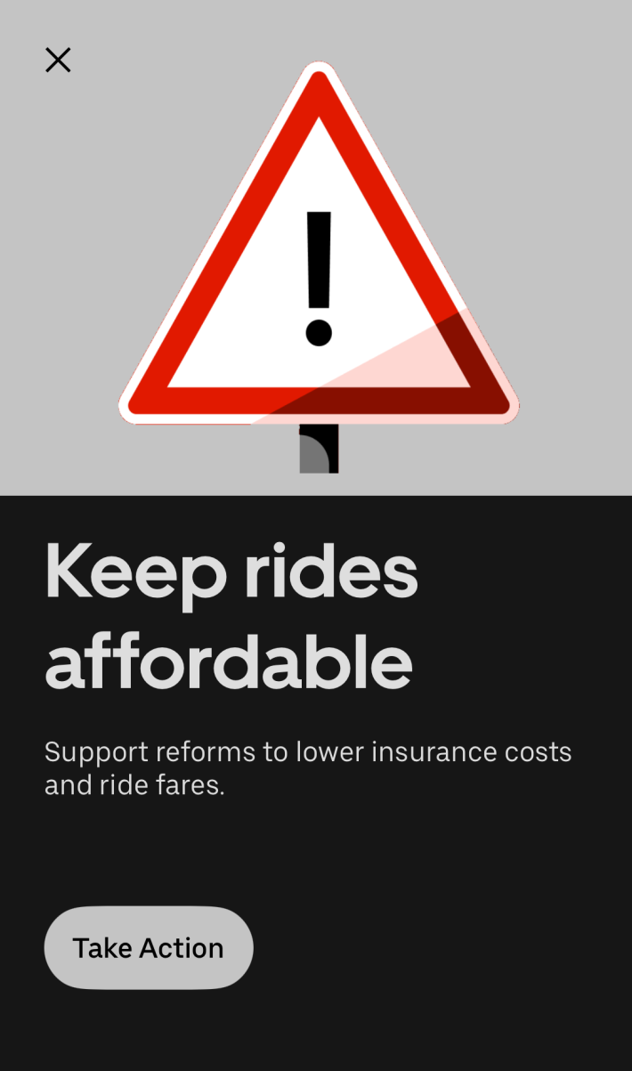 "Onerous and outdated laws in New York State have led to rampant fraud and legal abuse, which are driving up the costs for everyone. With commonsense reform, auto insurance, goods, and more will become more affordable, while still giving adequate protection to victims of accidents [sic]," reads one such "message from Uber."